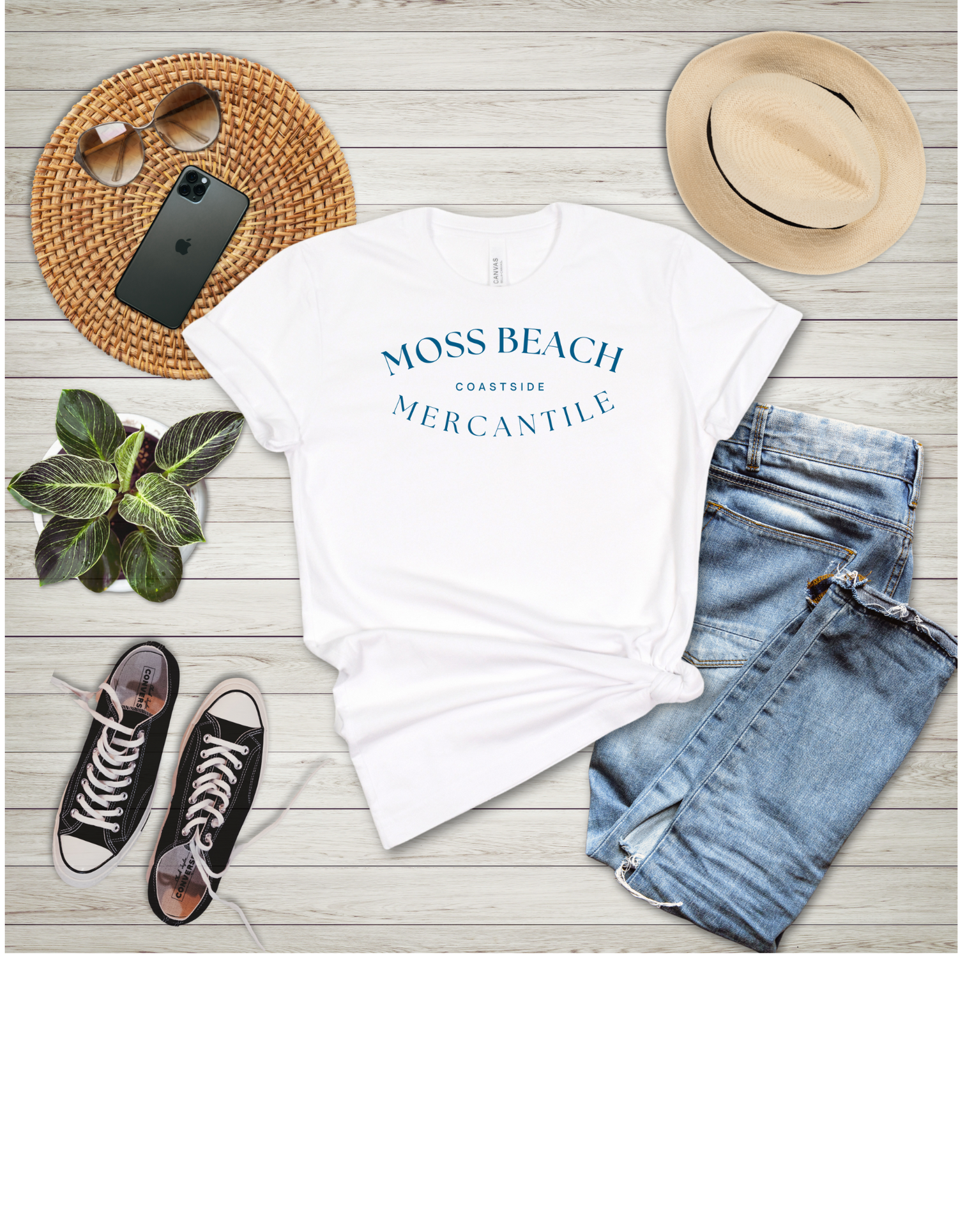 Beachy, super soft white Bella + Canvas cotton blend Tee, with Signature Moss Beach Coastside Logo